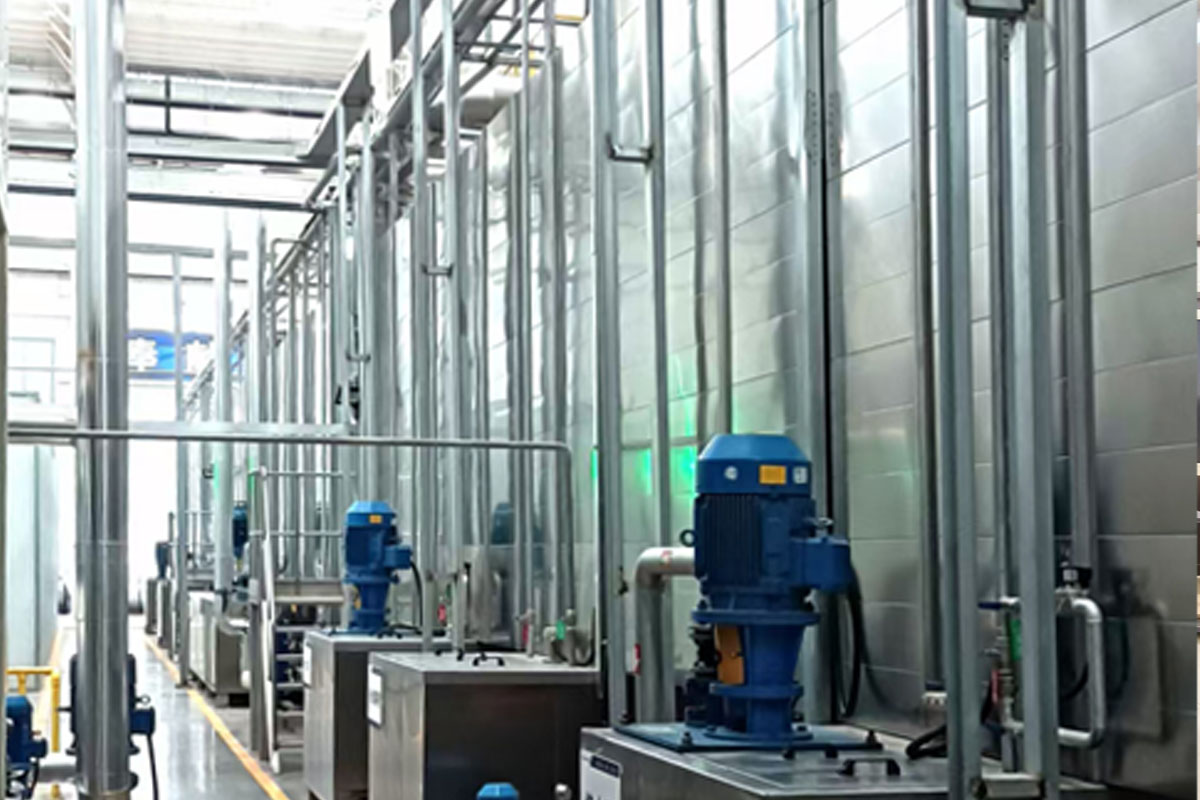 前處理生產線結構特點是:前處理生產線各工序噴淋管布置在隧道內,噴淋由各液槽的泵來提供.各工序間都有門洞板隔開,以防竄液.各加熱液槽的加熱形式有槽內和槽外。內加熱器有排管、蛇形管、波紋板等;外加熱器有列管、板式加熱器等。加熱介質有熱水 、蒸汽、導熱油等。在脫脂、磷化工序分別設有除油系統和除渣系統。為防止各加熱段隧道頂部及門洞處溢出蒸汽,在隧道頂部設有排風機。